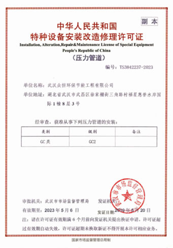 快訊 武漢眾恒環(huán)保節能工程有限公司四年一度的GC2壓力管道換證工作圓滿(mǎn)取得成功!今日武漢市場(chǎng)監督管理局向公司授予新的GC2壓力管道許可證,希望公司全體在壓力容器和石油化工壓力管道工程施工方面能以安全重于泰山、百年大計,質(zhì)量第一的思想做好我們的專(zhuān)業(yè)本職工作,為國家和社會(huì )的安全穩定作出貢獻!