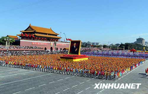 中新社北京十月一日十一時(shí)三十八分電(記者 路梅)中共中央總書(shū)記、國家主席、中央軍委主席胡錦濤的巨幅畫(huà)像,在“繼往開(kāi)來(lái)”方陣的簇擁下,經(jīng)過(guò)天安門(mén)廣場(chǎng)。廣場(chǎng)上同時(shí)響起胡錦濤主席的原音:“為奪取全面建設小康社會(huì )新勝利,譜寫(xiě)人民美好生活新篇章而努力奮斗!”這是胡錦濤的畫(huà)像首次出現在國慶游行的隊伍當中。在現場(chǎng)聯(lián)合軍樂(lè )團和民族打擊樂(lè )團的伴奏下,合唱團高唱歌曲《江山》,背景中呈現“科學(xué)發(fā)展”四個(gè)大字。