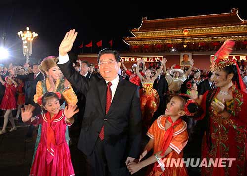 胡錦濤等黨和國家領(lǐng)導人與廣場(chǎng)上群眾一起聯(lián)歡