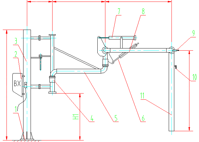 1、根部迥轉器2、短管3、中間迥轉器4、升降迥轉器5、平衡器6、長(cháng)臂7、垂直管