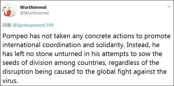 另一名網(wǎng)友則指出:“蓬佩奧沒(méi)有采取任何具體行動(dòng)來(lái)促進(jìn)國際協(xié)作與團結。相反,他還不遺余力地試圖在各國之間播下分裂的種子,不顧這對全球抗擊病毒斗爭所造成的破壞!
