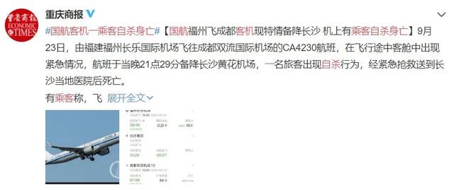 9月23日晚,有網(wǎng)友爆料國航CA4230航班疑似有乘客自殺,最后飛機備降長(cháng)沙。據了解,該名乘客被送到長(cháng)沙醫院后,搶救無(wú)效死亡。 據該航班的乘客表示,當時(shí)飛機進(jìn)入巡航高度以后,飛機艙內就出現了緊急情況,工作人員立刻展開(kāi)了處理,飛機上的醫務(wù)人員也加入到了搶救中。